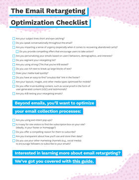 Here are 18 email retargeting optimization tips all ecommerce stores could benefit from. We recommend bookmarking this page or downloading the interactive checklist below, so you can revisit and tweak your strategy every quarter.