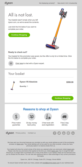 Like the examples mentioned above, Dyson pulls in a specific product relevant to a given recipient and includes multiple “continue shopping” buttons to make it easy to complete the sale in a few clicks. Dyson also provides four clear reasons to shop with Dyson at the end of the message with various icons for value-adds, such as its price match guarantee and free two-day delivery.
