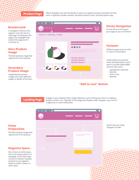 Contrary to what you may assume, you don’t have to write a single line of code to get a fully functioning Shopify store up and running. With that being said, it’s still helpful to familiarize yourself with the most commonly used web design elements. Without further ado, we’re here to introduce you to all the new vocabulary and elements to get started on building an incredible Shopify store from scratch. Not only does this visual guide cover the key terminology and definitions you need to know, but we’ve also made it even easier by showing you exactly what we’re describing by mapping them onto a typical website template. (P.S. Don’t forget to bookmark this page for easy access as you add more features, pages, and apps to your growing ecommerce store.)