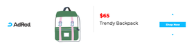 To feature multiple products, you can use a carousel. AdRoll’s classic carousel dynamic ad template includes an animated call-to-action when a retargeted consumer hovers their mouse over the ad. A variety of deals can spur browsing consumers to take action as it is more likely to include a product that sparks their interest.
