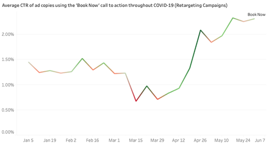 Let’s take travel, for example. Travel-related advertising took a huge dip, both in terms of views and click-throughs. However, in the last month, the “BOOK NOW” call to action has seen a 50% increase in CTRs.