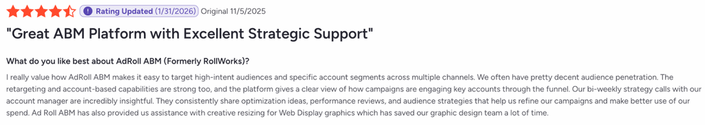 Our goal is always to build tools that enable advertisers to achieve their goals, whether that’s through wide-reaching brand awareness or targeted ABM. These rankings simply reflect the hard work of our customers and what AdRoll enables.