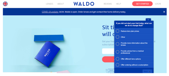Case in point: Waldo, the popular UK-based D2C contact lens brand, does a wonderful job of branding on its home page. Note the appealing consistency of the brand colors — patriotically British — and the clean, no-fuss layout of the page. The COVID-19 update is clear and smart, with a pun that winks at social distancing rules and the company product: “get contact-free home delivery today.” Plus, there’s the all-important survey that pops up so that customers know the brand really cares what they think. This is a great case study in powerful branding, thanks to a few small details that make a huge difference.