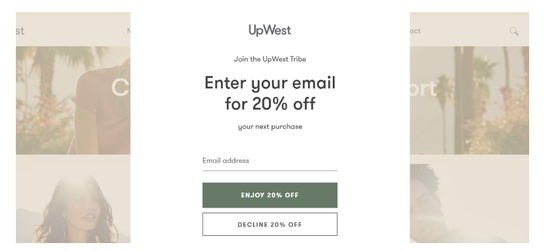 Case in point: A simple pop-up when first-time visitors land on the website is an easy, low-cost method for building a customer list. D2C apparel brand UpWest does a great job with a discount offer in exchange for signing up to its distribution list. Take a look at the powerful CTAs. The black-and-white choice to “Enjoy” or “Decline” 20% off is perfectly formulated to encourage the customer to enjoy it. Even if they don’t end up purchasing, their email address has been added to the list for future campaigns.