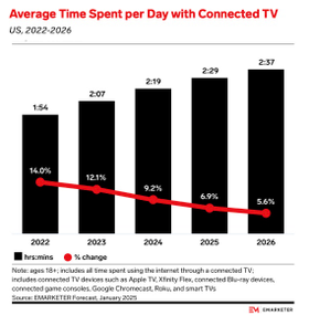 In 2020, the average US time spent with CTV averaged one hour and 22 minutes (1:22). By 2026, we forecast the average US time spent with CTV is expected to almost double from 2020, reaching 2:37.