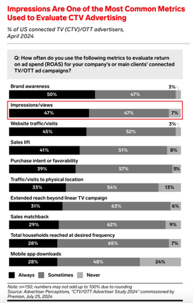 Half of CTV over-the-top (OTT) advertisers always use brand awareness to evaluate return on ad spend (ROAS), and almost half (47%) said they always use impressions or views to evaluate ROAS, per an April 2024 study from Advertiser Perceptions and Premion:
