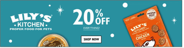 That’s what Lily’s Kitchen seeks to do with its Black Friday messaging. It updated the digital ads we saw above with some seasonal flair. Now, the static block showcases its Christmas Spectacular Holiday Treat for Dogs, while the dynamic features retain the product scroll, the offer for 20% off, and the Shop Now button. The product scroll feature has also been tweaked slightly to encompass more of the brand’s holiday fare, such as its advent calendars for dogs and cats and Christmas Spectacular dog treats. This is a great reminder to existing Lily’s Kitchen customers to stock up on special holiday treats for their dogs and cats.