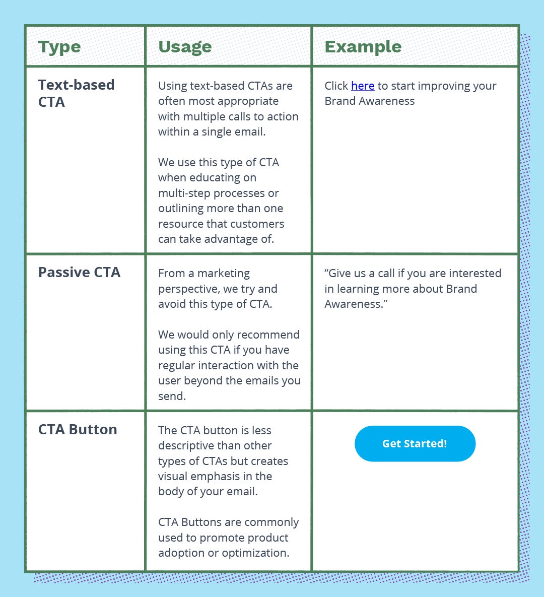The CTA is typically tied to the purpose of the email. What is it that you would like the reader to do — visit a landing page, adopt a product, update their contact information? There’s a lot to think about when building a CTA. The table below should help you identify which type of CTA is best suited for your campaign.