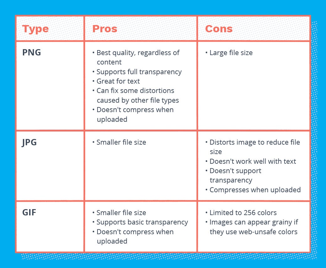 The table below compares commonly used image files and the benefits that come along with using them.