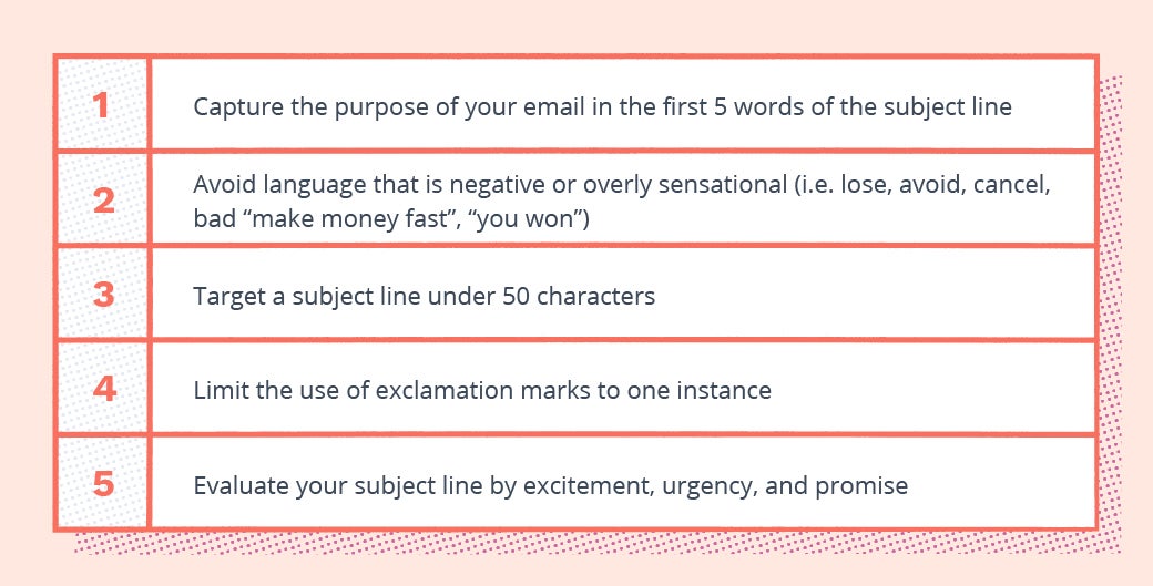 - Avoid excessive use of symbols or punctuation in your subject lines. Too many exclamation or question marks can send your message straight to spam.