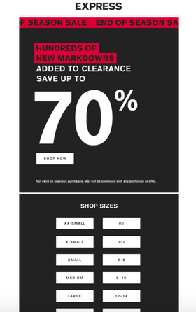 Express’ flash sale promotional email makes it even easier to shop by letting customers browse by size.