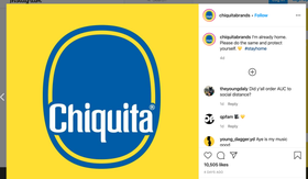 In the current climate, even the “First Lady” of fruits works from home! Chiquita Brands International company posted a version of its famous blue label logo without Miss Chiquita saying, “I’m already home. Please do the same and protect yourself.”