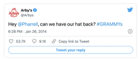 Arby’s Tweet, which poked fun at the oversized hat Pharrell Williams wore at the Grammys, immediately went viral.