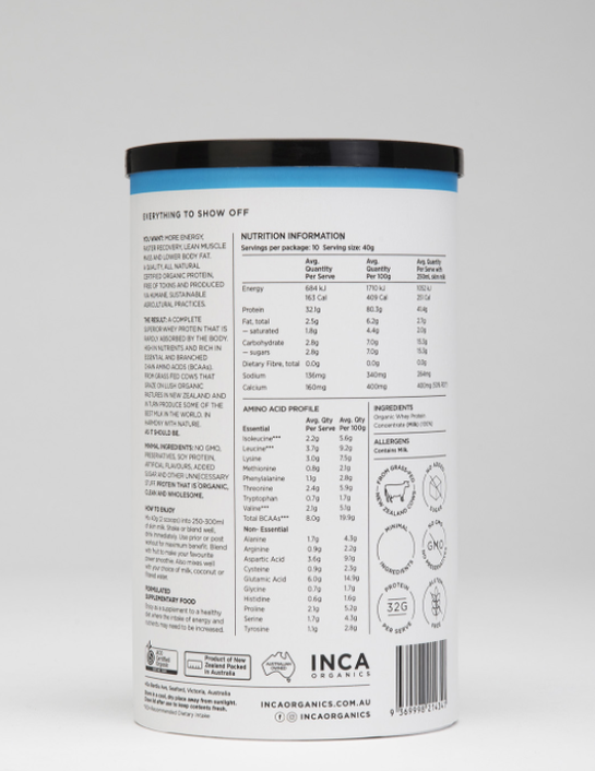 Image: "Nothing to Hide, Everything to Show Off" loading="lazy" — the back of INCA Organics' Whey Protein Powder