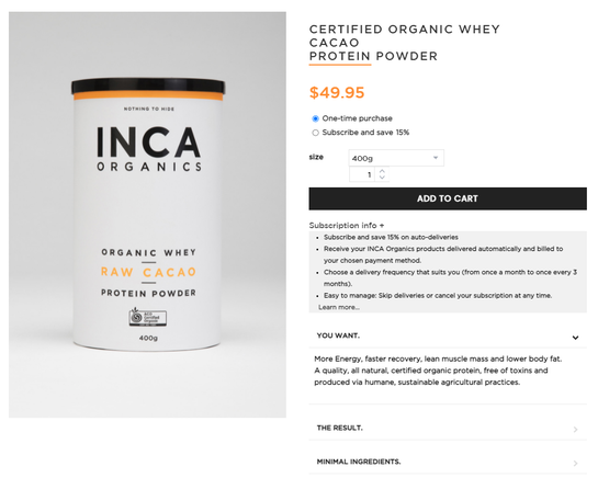 "The INCA Organics protein powders are products that consumers incorporate into their regular diets. As such, we offer a subscription option via our ecommerce site, and the customer has the flexibility to have their products replenished monthly, bi-monthly, or quarterly. In addition, since customers like to be in control, we provide them with options to pause, vary the regularity or cancel their subscription at any time.”