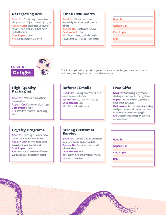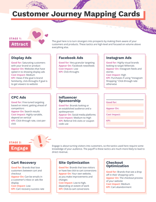 Luckily, we’ve got you covered with these customer journey mapping cards below. All you need to do is print and cut them out. Then, when you’re ready to launch your unstoppable campaign, simply mix and match tactics from each stage of the flywheel to develop an all-encompassing tactical plan that spans everything from attracting strangers all the way to delighting your loyal customers. Really, it’s that simple!