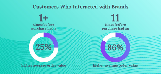 A study from digital marketing agency R.O.EYE found that customers had seven brand interactions before they made an "optimum" online sale. These customer interactions happened across multiple channels, including Google AdWords, affiliates, display ads, blogs and forums, email campaigns, Facebook, and direct traffic. The study also found that customers who interacted more than once with a brand before purchase had a 25% higher average order value, and customers who interacted with brands 11 times before purchase had an 86% higher average order value.