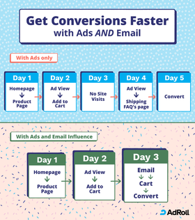 Lastly, in addition to separating browsers from cart abandoners and creating compelling messaging that’s attention-grabbing and FOMO-inducing, AdRoll's data shows customers who receive both email and digital ad retargeting messages make purchases 2x faster than those not receiving both. So, by remembering to use both channels — including display ads, social ads, and emails — and segment your retargeting efforts between browsers and cart abandoners, you can expect to convert shoppers more efficiently and effectively than ever before.