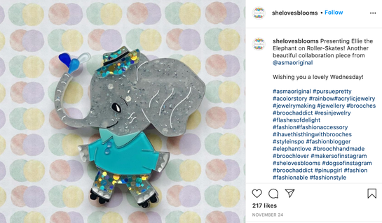 “In my role as the active participant, I usually share my maker’s release and would try to gain insights on their interests,” says Yvette. “As a passive observer, I would usually look at their feedback, reviews, or comments on their preferred brooch type and brooch colors. These valuable insights are helpful to gain perspective for brooches that speak more to them.”
