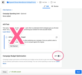 The "Campaign Budget Optimization" toggle in the campaign tab shifts budget control between campaign level and ad set level. "Off" means setting budgets at the ad set level, while "On" means a campaign-level budget which Facebook distributes among ad sets based on performance. Campaign level often allocates most of your budget to the ad set with the largest target audience. For the moment, you can avoid turning the A/B test option and create your ad set.