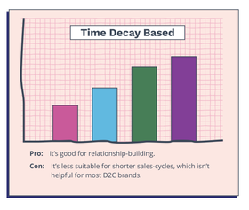 The time decay model is similar to the linear attribution model—credit is spread among all of the touchpoints, but time is also a factor. Less credit is given to the first interaction, while the last interaction receives more credit. For example, the first touchpoint in the form of a flyer may not get much credit, but the click on the call to action button on the website gets much more.