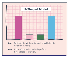 The U-shaped model is similar to the W-shaped insofar as it distributes credit unevenly across the sum of the marketing efforts. In this model, the most credit (80%) goes to the first, and the last touchpoints and everything else (20%) is doled out to the middle.