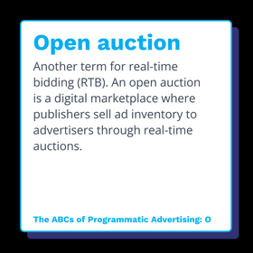 Another term for real-time bidding (RTB). An open auction is a digital marketplace where publishers sell ad inventory to advertisers through real-time auctions.