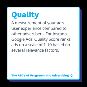A measurement of your ad’s user experience compared to other advertisers. For instance, Google Ads’ Quality Score ranks ads on a scale of 1–10 based on several relevance factors.