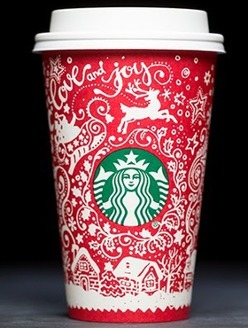 As you’re probably familiar, Starbucks’ holiday cups have since included safe, tasteful images, abstract patterns, and iconography that evoke the holiday spirit, coupled with that joyous shade of red.
