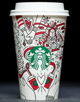 Starbucks received more than 1,200 submissions, of which they picked 13 hand-drawn white designs against a red background created by customers from six different countries.