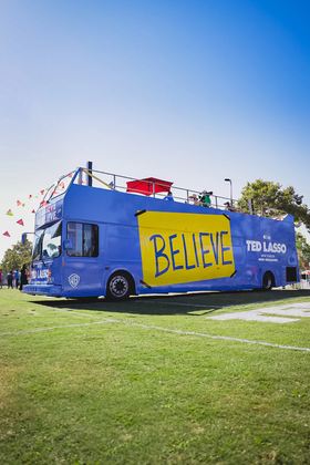 Ted Lasso’s immersive marketing doesn’t just stop at merchandising. Apple TV+ launched traveling marketing activations, inviting viewers to participate in Instagrammable fan experiences. Immerse yourself in a branded photo installation, take a ride on a double-decker “Believe Bus,” or party at a themed tailgate.