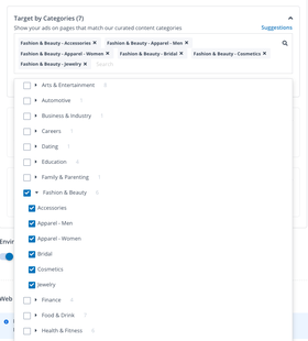 Consider targeting categories as well if your campaign falls into one of our 50 predefined contextual targeting categories — with everything from Sports, Automotive, Travel, Finance, and more.