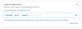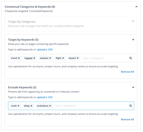 This is particularly relevant for retargeting campaigns to better control your ad placements. You can provide positive keywords that support your brand messaging or add negative keywords associating your messaging with themes or topics that don’t resonate with your audience.