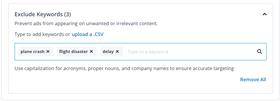 Negative keywords are the keywords you want to exclude for brand safety. A perfect use case is for airlines. They might use negative keywords such as "plane crash" or "flight disaster" to ensure their ads never appear on news articles covering these topics.